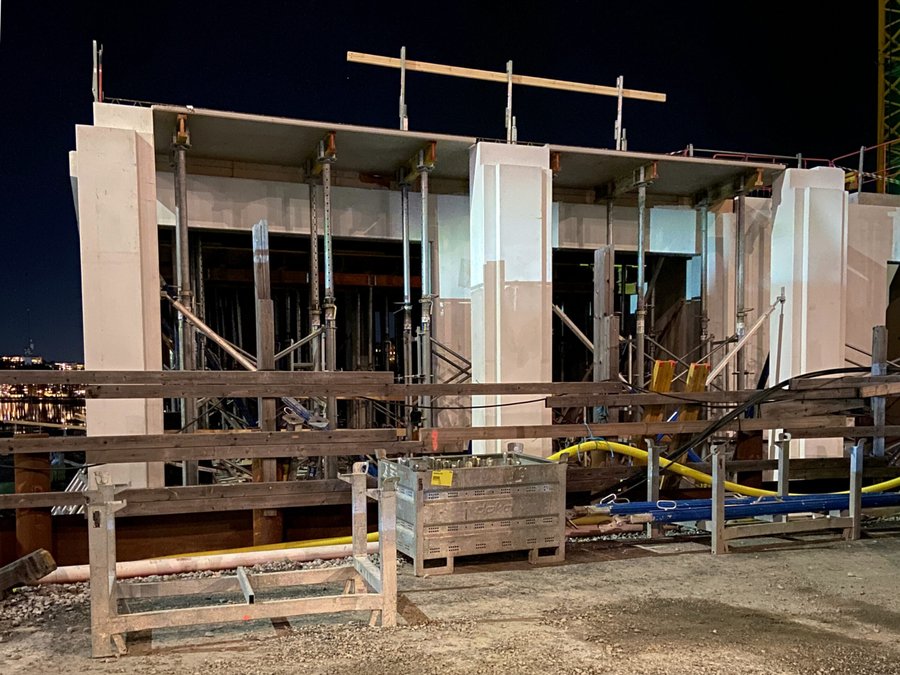 På bild syns entréplanets sydöstliga pelare och starten på vad som kommer bli en arkadgång i den fasad som är placerad mot Essingeleden. Husets gestaltning utgår från en symmetrisk fasad med ett varierande rutnät. Fasaden i infärgad vit betong kompletteras med plåtdetaljer och fönsterkarmar i en varm, dämpat gyllene ton.