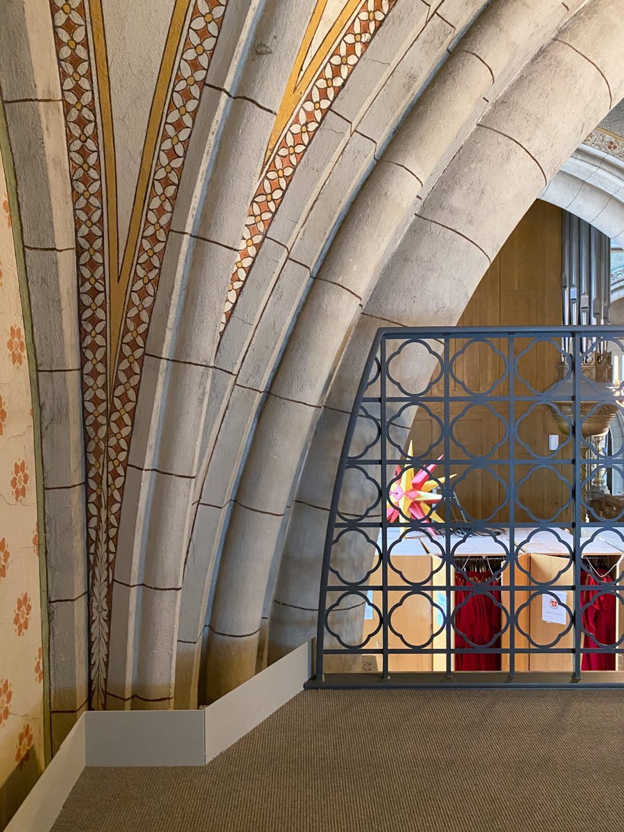 För att göra så lite åverkan som möjligt på kyrkans murar är bjälklagen utförda fristående på smäckra pelare med släpp från vägg. Smidesräckena i framkant hämtar inspiration i gotikens formspråk och knyter an till befintliga detaljer i kyrkorummets arkitektur.