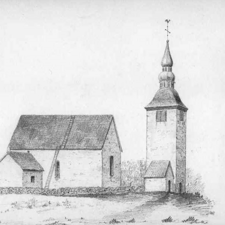 Bild: teckning av kyrkan och kastalen före 1880-talets ombyggnad.