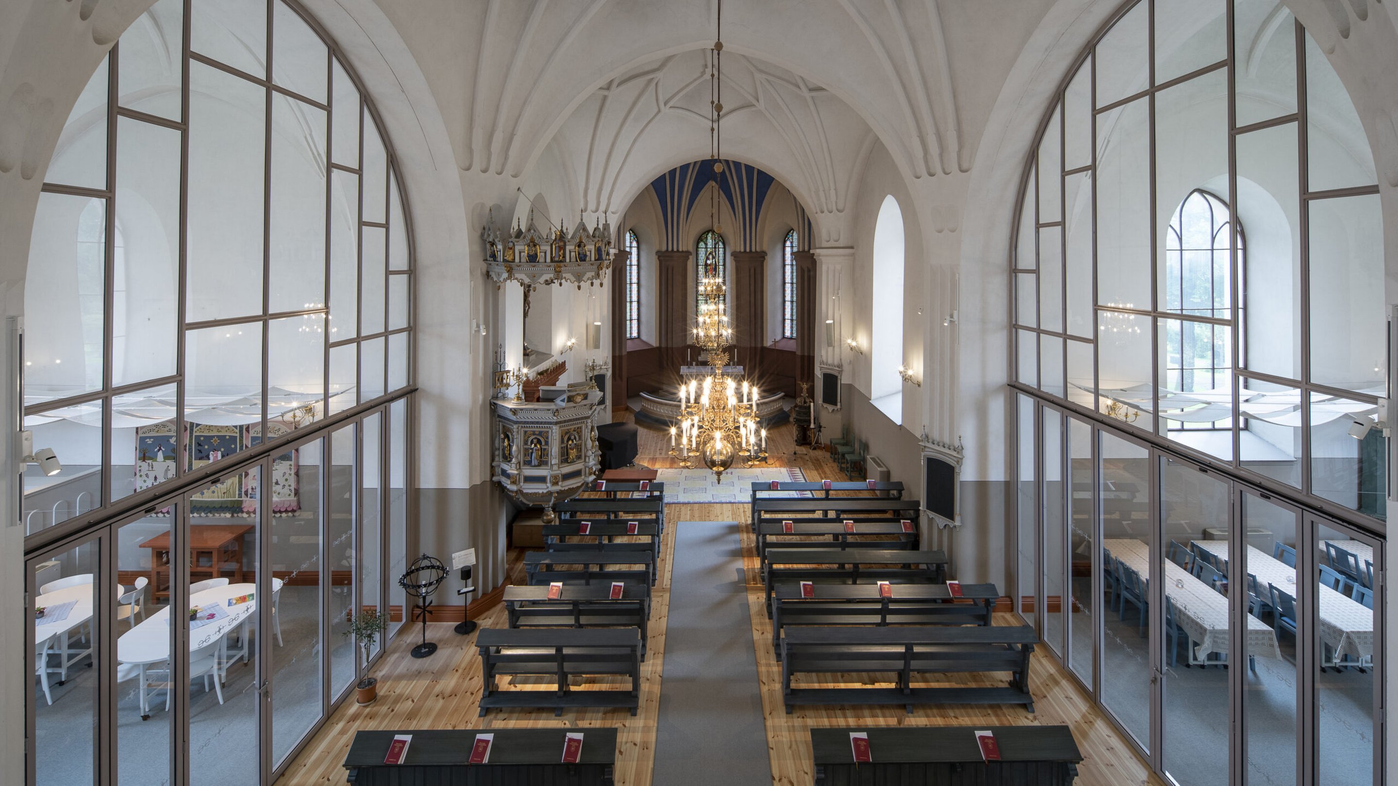 Tillkommande stora glaspartier i kyrkans valv delar in kyrkorummet i flera rumsligheter samtidigt som den medeltida korskyrkans tydligt kan avläsas i sin helhet. I den södra korsarmen skapades rum för församlingens körverksamhet samt för kyrkkaffe, medan den norra armen nyttjas för kyrkans barnverksamhet.