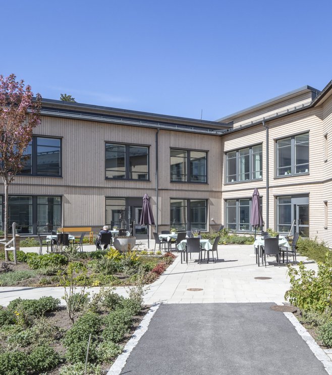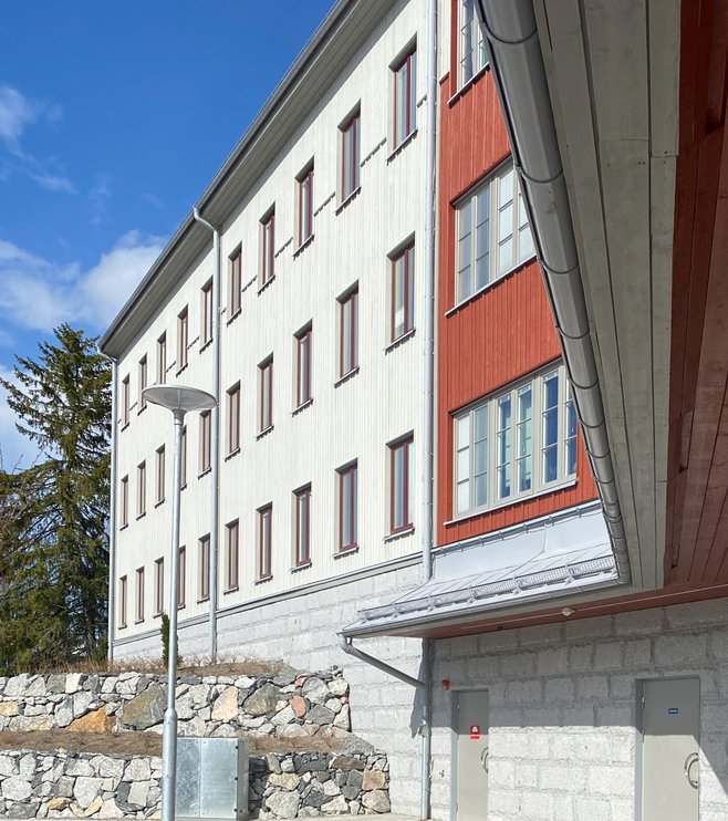 Fasaden utförs i infärgad vit betog med vit ballast där fasadens inskjutna kassetter skapar ett skuggspel i fasad som varierar över dagen och året med solens position. Den sammantagna gestaltningen landar i en symmetrisk fasad med stadig rytm och ett harmoniskt, monolitiskt uttryck.