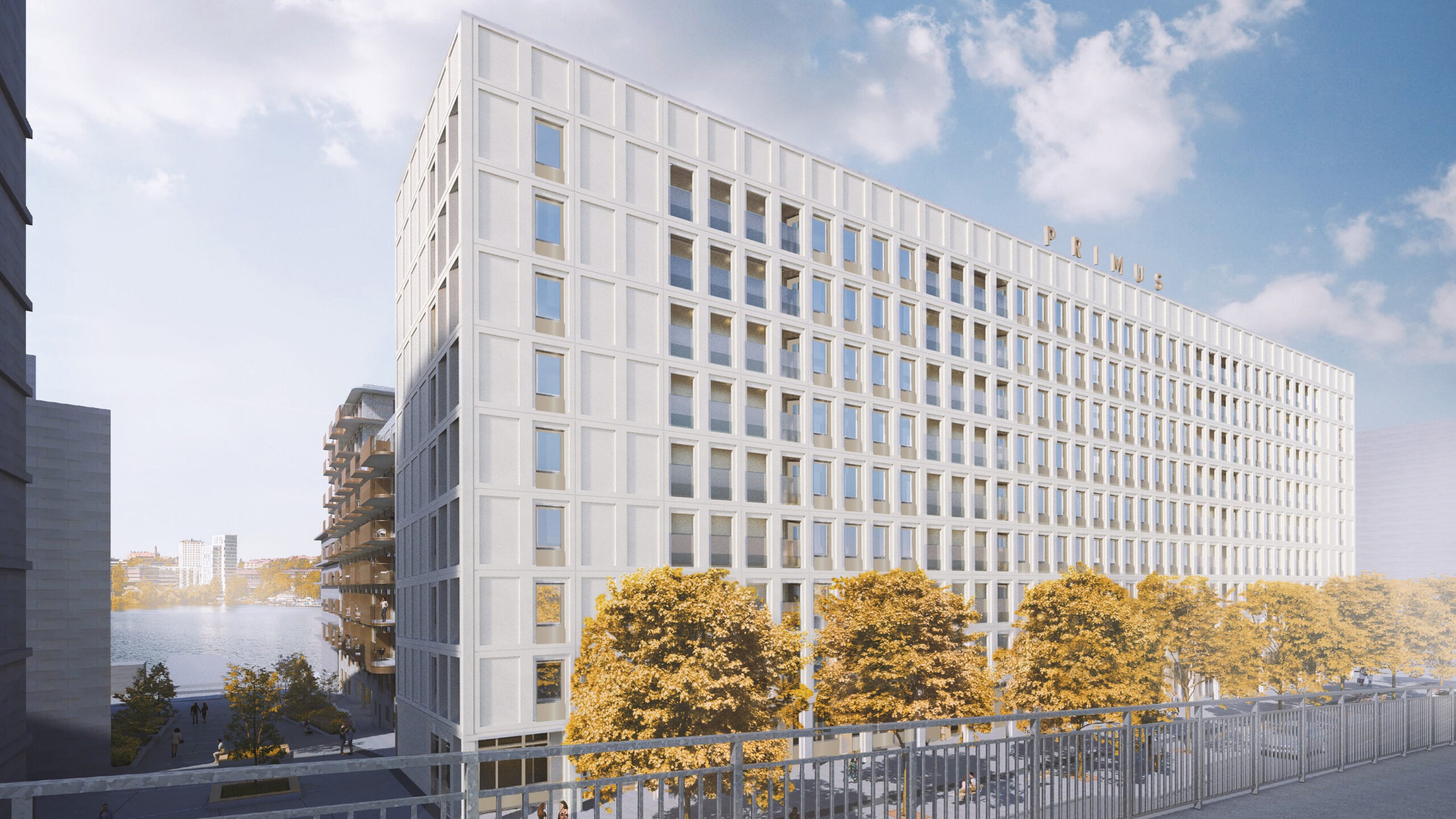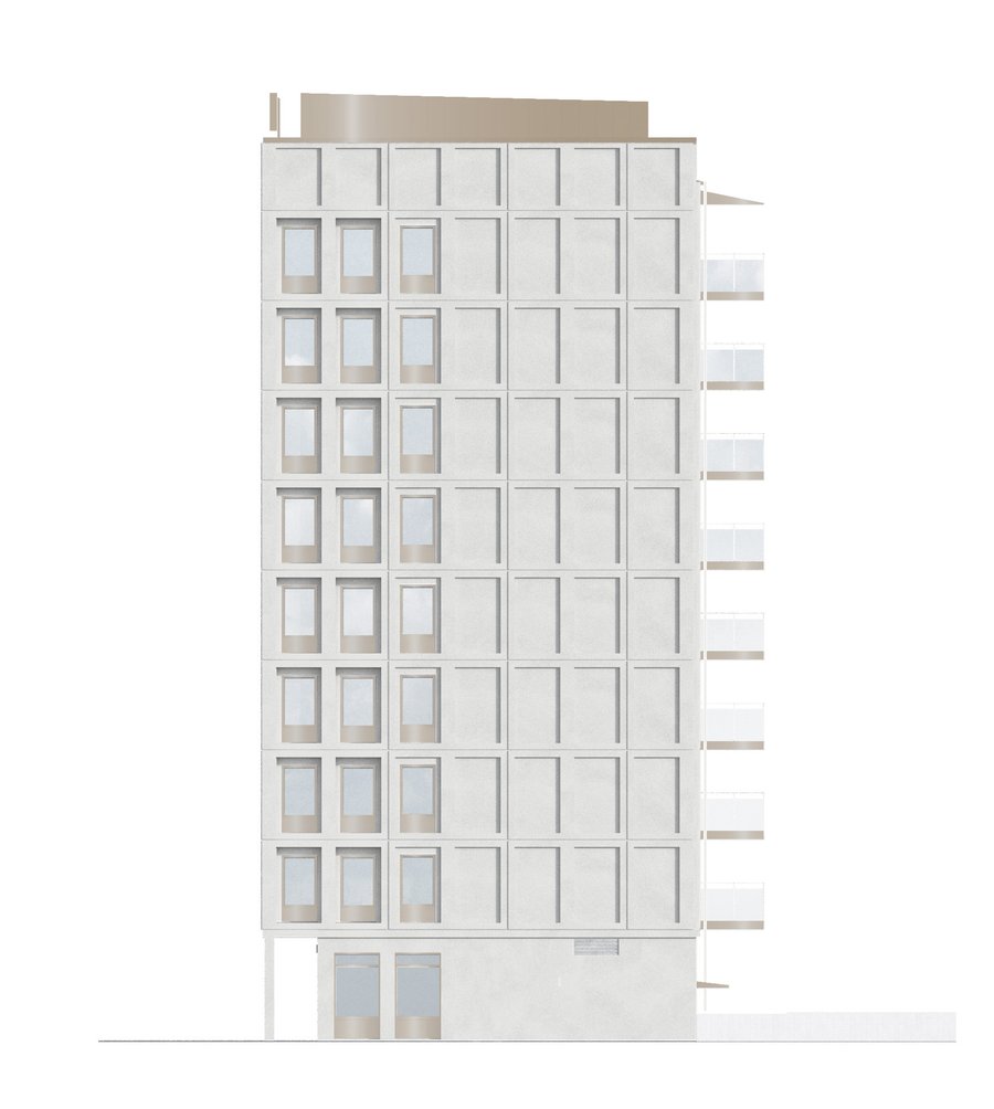 Konceptet för fasadens gestaltning bygger på prefabricerade fasadelement i betong med kassetter i två fack. En utskjutande yttre relief ramar in elementen och skapar djup och skuggverkan i ett repetitivt geometriskt mönster. Fasadelementen består av infärgad vit betong, där den inre kassettens djup förstärks med reliefens skuggverkan. Betongelementens dimensioner möjliggör en harmonisk blandning av öppet och stängt med minimal variation i fasadens övergripande komposition. Fasadelementen kommer i tre huvudsakliga variationer: helt stängd, med fönster, eller med öppning in till balkonger.